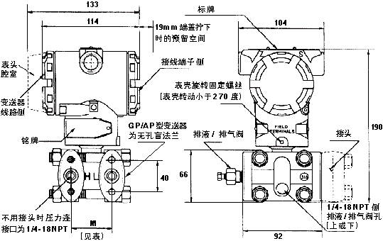 变送器连接头B: 1/2-14NPT引压接头后部焊接引压管(选型代码为C12)