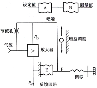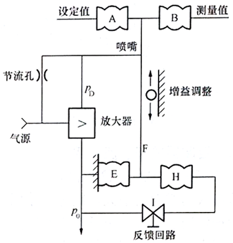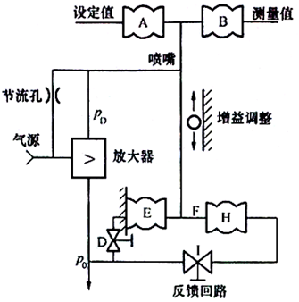 一个假想的气动比例调节器原理如图1所示。误差的检测由波纹管A和B来实现,测量值或设定值的任何变化都将导致挡板的移动,经喷嘴挡板机构放大后,至功率放大器再进行功率放大,其输出P0又经反馈波纹管E和驱动杆F作用于挡板,最后使调节器输出P0稳定在某一值,并实现与测量值和设定值之差成比例。气动调节器的比例增益可通过改变增益调整球的上下位置进行整定,气动调节器的输出零点可通过调零弹簧进行调整,气动调节器正作用、反作用可通过改变测量信号和设定值信号输入波纹管A和B的方法来实现。在图中,测量信号进入波纹管B,设定信号进入波纹管A,气动调节器是正作用如果改为测量信号进入A,设定信号进入B,则变为反作用。