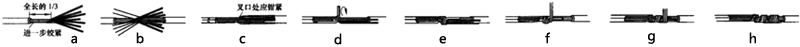 如图4a所示首先把两个多股导线散开拉直,并将占全长三分之一的导线绞紧,然后把剩下三分之二部分导线分散成伞状,把两股导线的伞状芯线头隔根对插(如图4b),并将其中一端的芯线分成三组。将第一组的芯线扳起并垂直于芯线,按顺时针方向紧绕2圈(见图4c、d),把第二组的芯线仍按顺时针方向紧紧压住前面的芯线,缠绕2圈(见图4f),把最后一组的芯线按上述方法顺时针方向紧紧压住前芯线缠绕4圈(见图4g).最后切去每组多余长度的芯线,平整端部,去除毛刺。用上述方法缠绕另一边芯线(见图4h)。