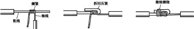 单股铜芯线和多股铜芯线一字型接头的连接如图3所示。首先将多股铜芯线缠绕在单股铜芯线上,然后将单股铜线折回压紧,最后用多股铜芯线将单股铜芯线(两股)缠绕5-8圈即可。