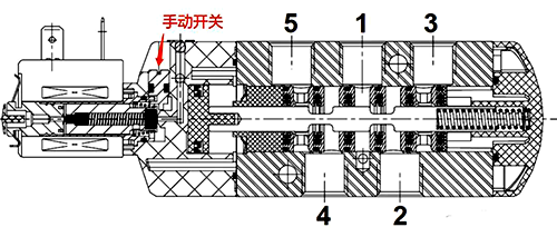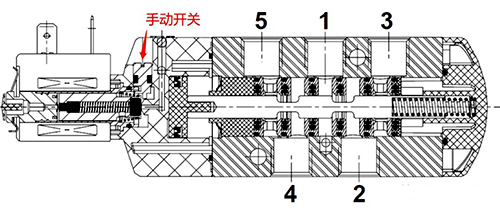 当ASCO 531电磁阀电源故障没电时,可以通过手动开关控制阀位切换,逆时针旋转手动开关,铁芯向左运动,阀芯向右运动,进气口1与出气口4相通;