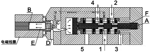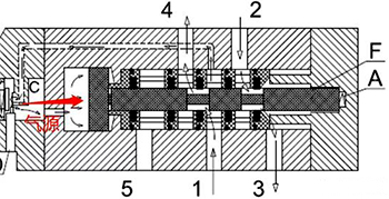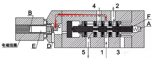 在电磁阀失电状况下,进气口1与出气口2相通,出气口4与排气孔5相通,活塞F在阀内弹簧A的弹力下保持在左边的位置,进气口1处的气源通过下图红色箭头孔(该进气孔为独立孔,只与进气口1连接,不与出气口4连接)连接腔室内的C进气口;