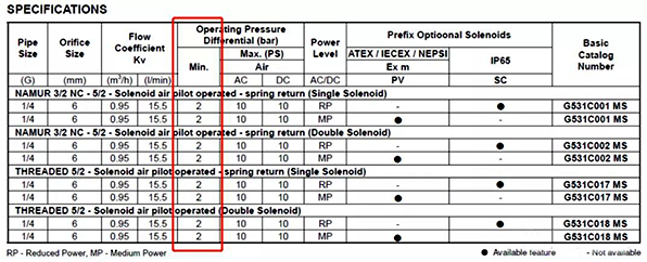 活塞F克服弹簧A的弹力向右运动,当进气口1的气源压力过小时,A的弹簧力大于气源压力产生的推力,活塞F将无法动作;所以电磁阀有一个最小动作压力,ASCO 531系列为2Bar;