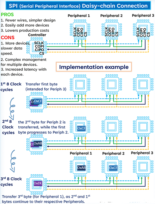 在我们使用一个控制器和三个外设实现菊花链SPI的示例中,数据传输在几个时钟周期中发生,每个时钟周期由8个时钟脉冲组成,说明了字节在外设之间的顺序传播。