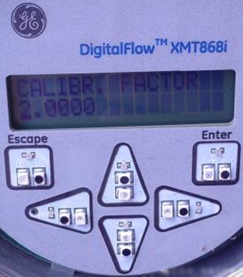 完成以上4步,流量计恢复了正常运行,但是发现超声波流量计指示值较正常值大一倍,约为4600t/h,查看相关参数,发现参数Calibration Factor(校正因子)被设置成了2,正常情况应该为1,该参数一般用于小范围的校准,具体步骤如下: