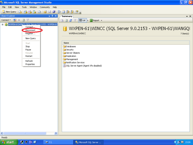 2、选择....\WINCC(SQL SERVER....,右键,如图所示,选择DisConnect..